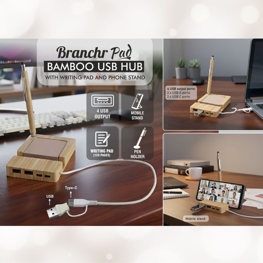 Multifunction bamboo USB hub with writing pad and phone stand,includes multiple USB output ports for connectivity and charging,combines productivity tools with organized desk design,ideal for office and study use