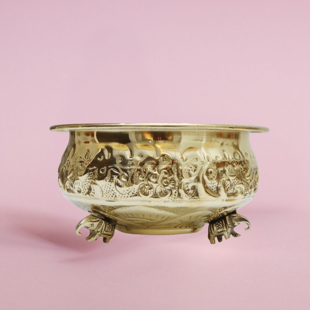 A double polished elephant urli in a classic design made from brass suitable for traditional decor and gifting