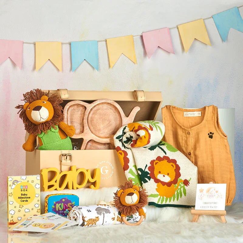 The Little Explorer Safari Hamper is a thoughtfully assembled collection that strikes curiosity in tiny explorers and ignites their senses. This hamper isn’t just an assortment of cute items; it is a curated kit that supports cognitive development. These whimsical treasures ease daily routines while sparking imaginative bonding. From playful lion roars in the nursery to gentle crinkles that stimulate the senses, every element is carefully chosen to create a joyous world of sensory engagement. It is a perfect gift for celebrating the arrival of a little star.