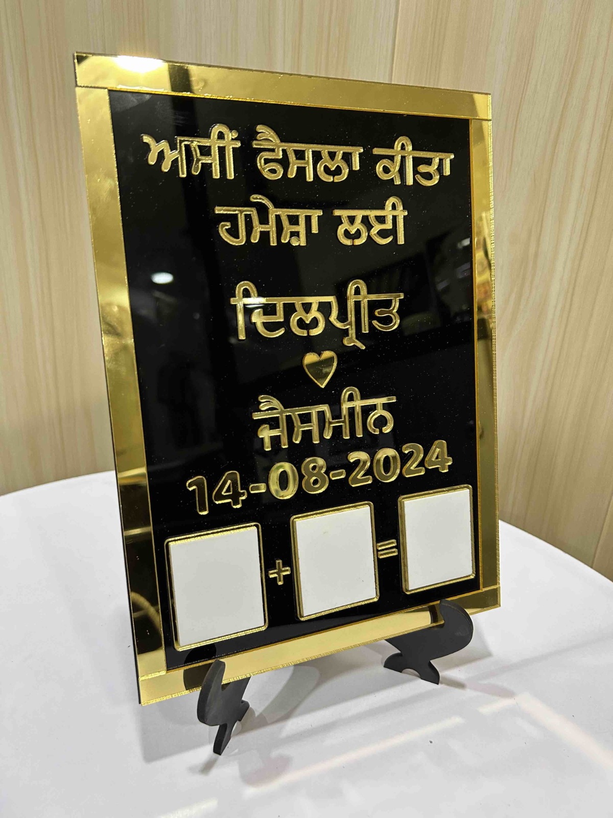 Add a premium touch to your memories with this Personalized Acrylic Name Frame featuring an elegant gold finish and custom text design. Crafted with high-quality acrylic, this frame allows you to personalize names, dates, and messages in multiple languages. Perfect for weddings, anniversaries, or special occasions, it serves as a timeless keepsake and stylish décor piece.