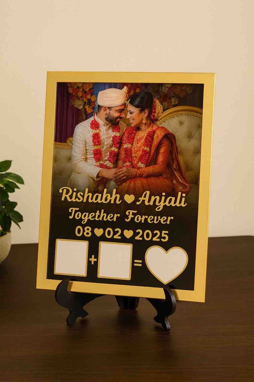 Celebrate your special moments with this Personalized Photo Frame, designed to showcase your cherished memories in a unique and meaningful way. Featuring custom names, date, and a romantic design layout, this frame is perfect for weddings, anniversaries, or gifting your loved ones. The premium finish and elegant stand make it a beautiful addition to any home décor.