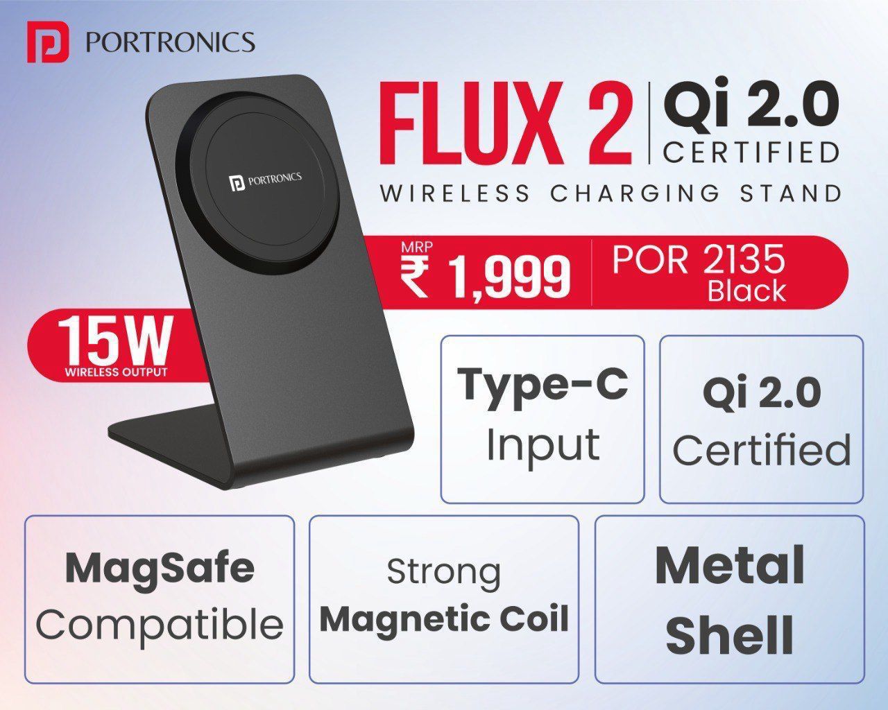 Charge your devices effortlessly with the Portronics Flux 2 Wireless Charging Stand, a sleek and powerful charging solution designed for modern smartphones. Featuring Qi 2.0 certification and up to 15W wireless output, this charging stand delivers fast and efficient charging while keeping your device conveniently positioned for viewing.