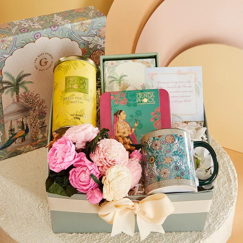 She tied a thread on your wrist, you gift her a piece of your heart. This hamper is more than a return gift. It’s a celebration of your lifelong bond. Thoughtfully curated to bring joy, it weaves together festive warmth, comforting flavors, and a touch of floral grace. The perfect return gift to sisters who’ve stood by you, teased you, and loved you endlessly.