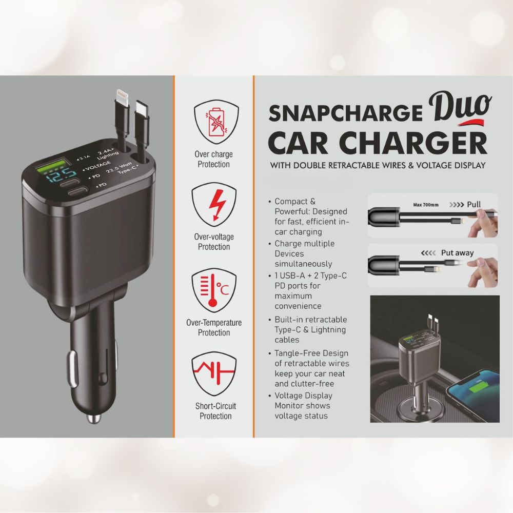 A powerful compact car charger equipped with dual retractable cables for clutter free usage supporting multiple device charging with USB A and dual Type C PD ports featuring built in Lightning and Type C cables with smooth extension along with voltage display and multiple safety protections