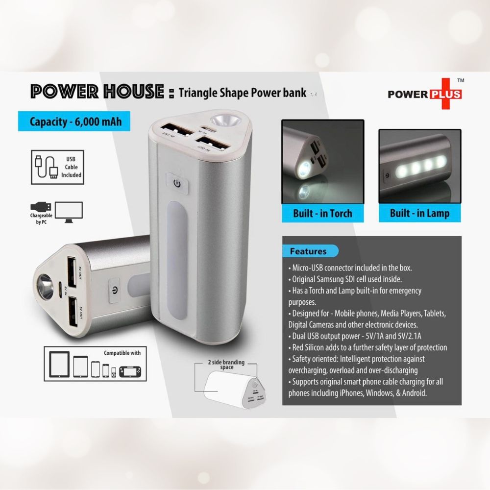 Compact triangle-shaped power bank with 6000mAh capacity designed for everyday charging needs,features dual USB output ports for simultaneous device charging along with a built-in torch and side lamp for emergency lighting,includes micro USB cable and supports safe charging with protection against overcharging,overload,and short circuits,compatible with smartphones,tablets,and other USB-powered devices